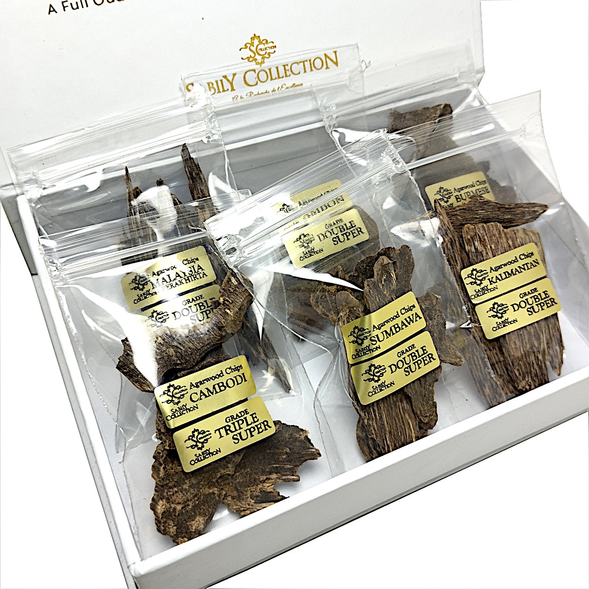 A beautiful box composed of 6 types of Oud, ( 3 grams each ), designed to let you discover a unique universe of rich and diverse aromatic profiles.